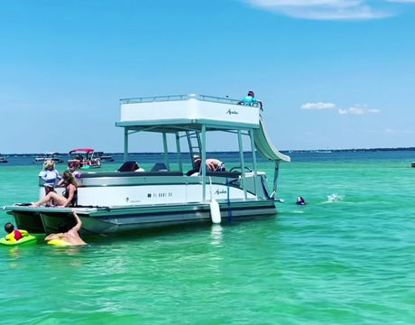 30a Pontoon Rental boats are equipped with a radio, shade, etc. Our Double Decker pontoon rentals are equipped with a super fun water slide. 30a Pontoon Rental strongly recommends suntan lotion, and long sleeve moisture wicking shirts and water shoes. The sun can be very harsh, and a long sleeve moisture wicked shirt can help with the direct sunlight. Food on the water can be expensive. As a result, we recommend packing your own food and drinks. If you plan to drink alcohol, we strongly recommend rotating bottled waters between each drink. It's very easy to get dehydrated and sick while out on the water. STAY HYDRATED!